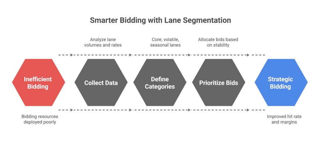 Freight lanes aren’t all created equal. Some routes are stable and predictable, while others fluctuate wildly with seasonality or economic factors. By segmenting lanes, you can deploy your bidding resources more strategically and improve your hit rate.